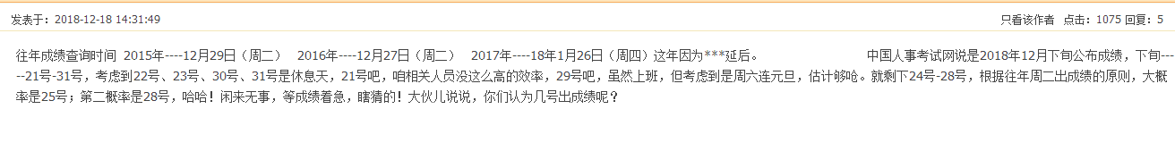 中國(guó)人事考試網(wǎng)說(shuō)是2018年12月下旬公布成績(jī),下旬——21號(hào)-31號(hào),考慮到22號(hào)、23號(hào)、30號(hào)、31號(hào)是休息天,21號(hào)吧,咱相關(guān)人員沒(méi)這么高的效率,29號(hào)吧,雖然上班,但考慮到是周六連元旦,估計(jì)夠嗆。就剩下24號(hào)-28號(hào),根據(jù)往年周二出成績(jī)的原則,大概率是25號(hào);第二概率是28號(hào),哈哈!閑來(lái)無(wú)事,等成績(jī)著急,瞎猜的!大伙兒說(shuō)說(shuō),你們認(rèn)為幾號(hào)出成績(jī)呢?來(lái)預(yù)測(cè)>>
