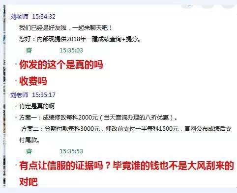 要是也有小伙伴遇到這種自稱和內(nèi)部工作人員有合作可以提前查成績(jī)并且改分的,那一定就是騙子了,一級(jí)建造師考試作為國(guó)家級(jí)的考試由人事部、建設(shè)部共同組織實(shí)施,不會(huì)存在花錢改分的問(wèn)題,所有等成績(jī)實(shí)在無(wú)聊的話也可以和騙子聊一聊解悶像上面的考友一樣,但是提到交錢的話要趕緊撤或者跟相關(guān)部門舉報(bào)。
