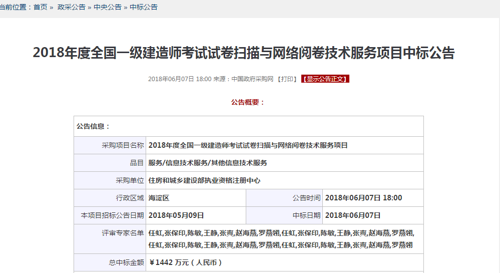 2018年一級建造師報名時間遲遲沒有公布,很多考生都很焦急,恐怕考試會有變故,無心備考。下面小建來給大家來一劑強心針,小建在中央政府采購網(wǎng)找到了《2018年度全國一級建造師考試試卷掃描與網(wǎng)絡(luò)閱卷技術(shù)服務(wù)項目中標公告》,注意是“中標公告”,這說明什么,考試一定會來的!下圖為18年試卷評分招標結(jié)果,大家可以安心備考了。
