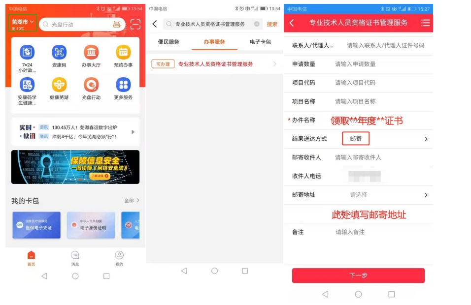 郵寄方式:方式1:移動端申請(推薦使用),手機(jī)下載皖事通APP,城市選擇蕪湖,搜索欄搜索“專業(yè)技術(shù)人員資格證書管理服務(wù)”,在線辦理。