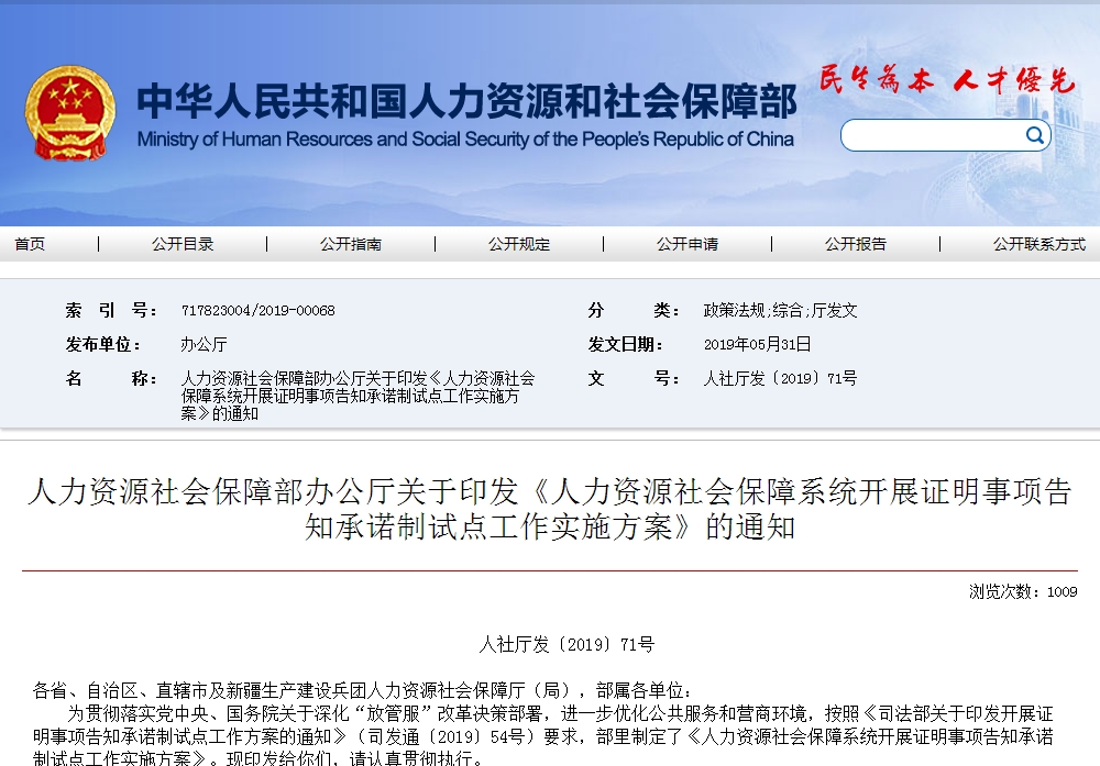 2019年5月31日人力資源社會保障部印發(fā)《人力資源社會保障系統(tǒng)開展證明事項告知承諾制試點工作實施方案》的通知,確定在6項社會保險經(jīng)辦和12項專業(yè)技術人員資格考試報名共18項政務服務中開展證明事項告知承諾制試點,7月前完成全面啟動。