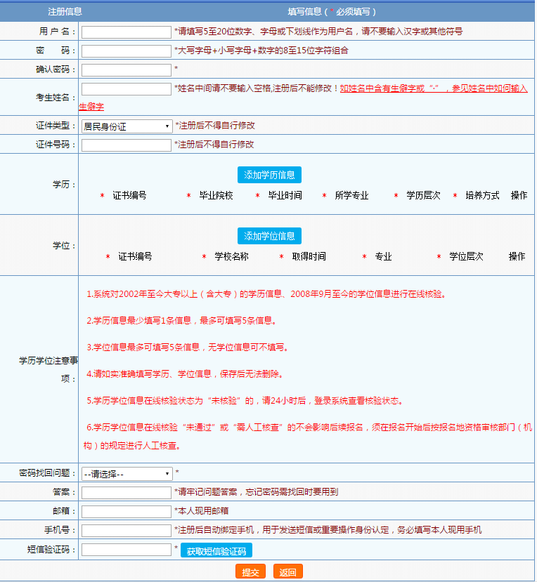 2、 身份證號、姓名將引用到報名信息中,手機和郵箱將作為報考人員接收相關(guān)考試信息的工具,請務(wù)必保證姓名、身份證號、手機和郵箱信息真實、準確、完整、有效。