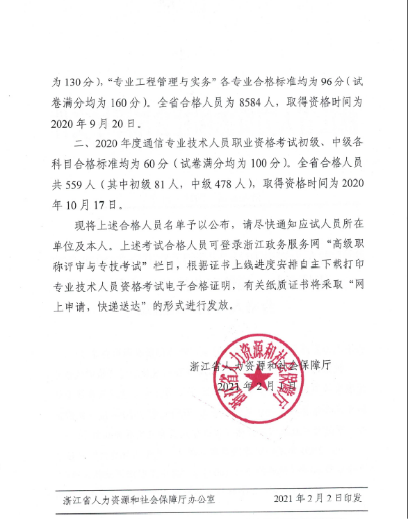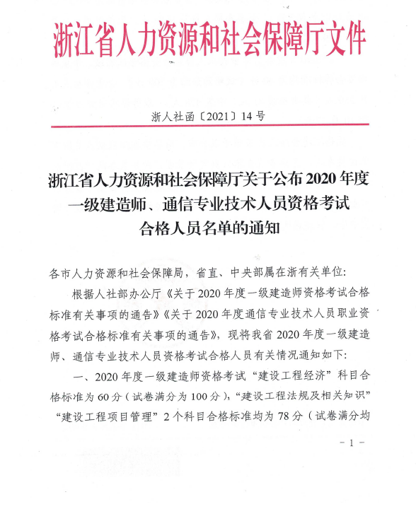 浙江省人力資源和社會(huì)保障廳關(guān)于公布2020年度一級(jí)建造師、通信專業(yè)技術(shù)人員