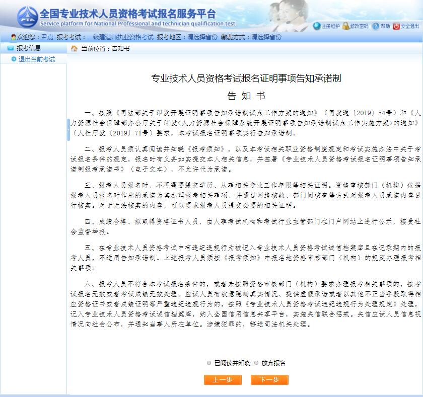 考生們選擇考試類別及考試地區(qū)后,需要仔細閱讀專業(yè)技術(shù)人員資格考試報名證明事項告知承諾制告知書: