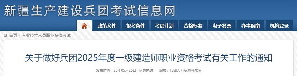 新疆生產(chǎn)建設(shè)兵團(tuán)考試信息網(wǎng)發(fā)布關(guān)于做好兵團(tuán)2025年度一級建造師職業(yè)資格考試有關(guān)工作的通知,具體信息如下: