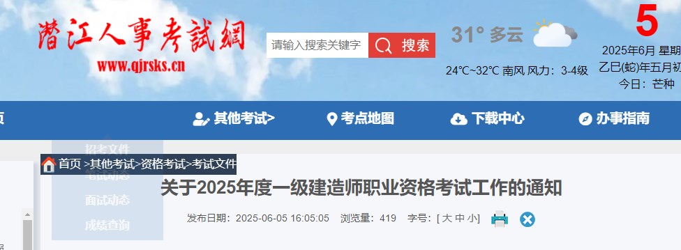潛江人事考試網(wǎng)發(fā)布關于2025年度一級建造師職業(yè)資格考試工作的通知,具體信息如下: