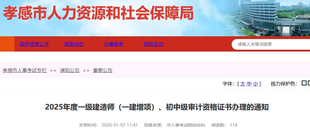 孝感市人力資源和社會(huì)保障局發(fā)布2025年度一級(jí)建造師(一建增項(xiàng))、初中級(jí)審計(jì)資格證書(shū)辦理的通知,具體信息如下:
