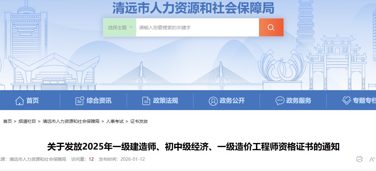 清遠(yuǎn)市人力資源和社會(huì)保障局發(fā)布關(guān)于發(fā)放2025年一級(jí)建造師、初中級(jí)經(jīng)濟(jì)、一級(jí)造價(jià)工程師資格證書(shū)的通知,具體信息如下: