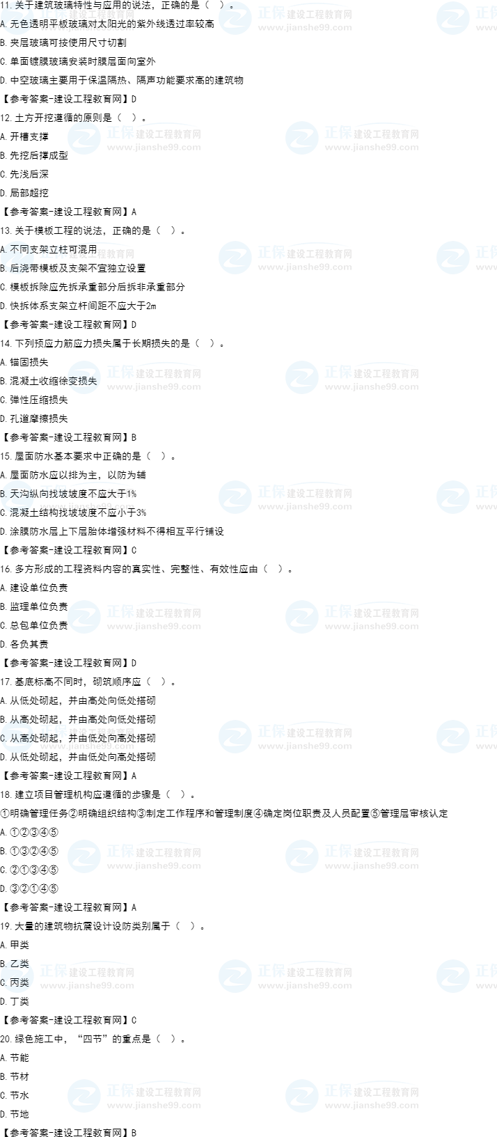 2022年一級(jí)建造師補(bǔ)考建筑工程試題及答案解析11-20題。建設(shè)工程教育網(wǎng)考后將會(huì)根據(jù)學(xué)員反饋,及時(shí)匯總2022年一級(jí)建造師補(bǔ)考建筑工程試題及答案解析分享給大家,并且會(huì)及時(shí)做出一級(jí)建造師答案解析,希望能為廣大一建考生朋友帶來幫助。