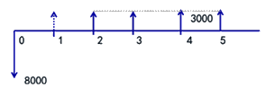 于是,根據財務凈現值的計算公式(1025),則有該方案的FNPV=-8000+3000(P/A,10%,4)×(P/F,10%,1)=-8000+3000×3.1699×0.909=645(萬元)。同時,根據靜態(tài)投資回收期的計算公式(思路),則有3000×3-8000=1000(大于零),由于運營期的1年+,進而算出靜態(tài)投資回收期為3.67年。參見教材P22~25。