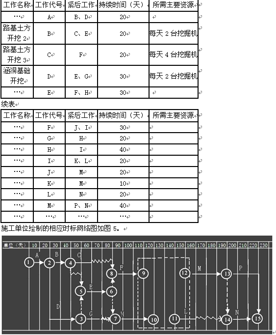 1. 按最早開始時(shí)間補(bǔ)充繪制時(shí)標(biāo)網(wǎng)絡(luò)圖中虛框內(nèi)的圖形(將虛框內(nèi)的內(nèi)容復(fù)制在答題卡上作答),并寫出關(guān)鍵線路和工期。