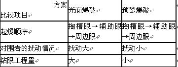 根據(jù)圍巖分級的綜合評判方法,該右線隧道圍巖分布有Ⅲ、Ⅳ、Ⅴ級圍巖。為確定YK9+730~YK9+790段施工方法,承包人對預(yù)裂爆破和光面爆破的工藝特點(diǎn)進(jìn)行了比較(如表3所示),結(jié)合本段的地質(zhì)特點(diǎn),決定采用預(yù)裂爆破方案施工。