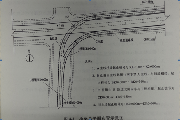 某市政工程公司承建城市主干道改造工程標(biāo)段,合同金額為9800萬(wàn)元,工程主要內(nèi)容為:主線高架橋梁、匝道橋梁、擋土墻及引道,如圖4-1所示。橋梁基礎(chǔ)采用鉆孔灌注樁:上部結(jié)構(gòu)為預(yù)應(yīng)力混凝土連續(xù)箱梁,采用滿堂支架法現(xiàn)澆施工。邊防撞護(hù)欄為鋼筋混凝土結(jié)構(gòu)。