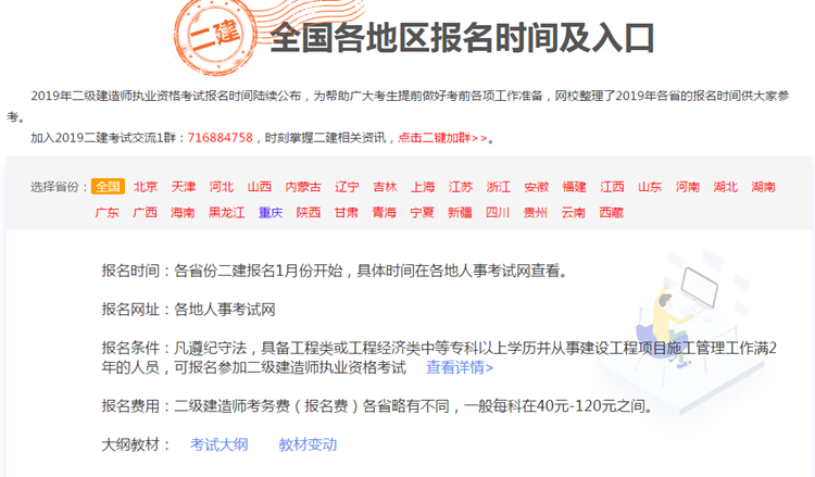 2019年二級(jí)建造師報(bào)名正式開(kāi)始了,考試教材已上市,考試時(shí)間也已公布,隨著各種2019年二級(jí)建造師考試信息的公布,2019年二級(jí)建造師備考正式開(kāi)始了!
