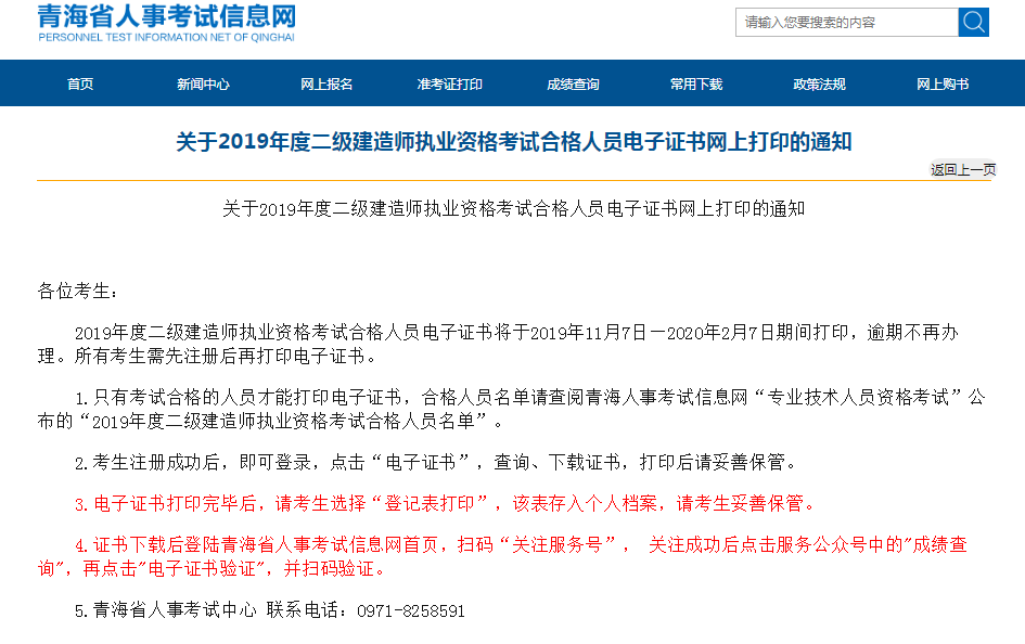 1.只有考試合格的人員才能打印電子證書(shū),合格人員名單請(qǐng)查閱青海人事考試信息網(wǎng)“專業(yè)技術(shù)人員資格考試”公布的“2019年度二級(jí)建造師執(zhí)業(yè)資格考試合格人員名單”。