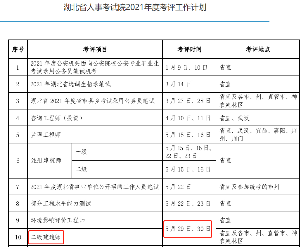 湖北人事考試網(wǎng)發(fā)布2021年度考評(píng)工作計(jì)劃,其中明確2021年湖北二級(jí)建造師考試時(shí)間為5月29日、30日。
