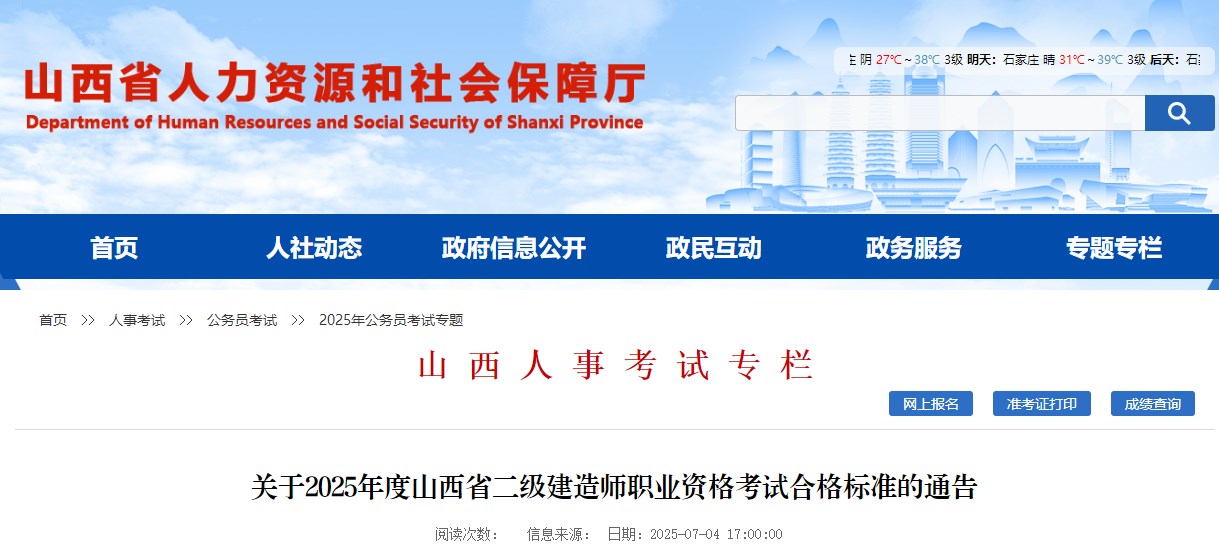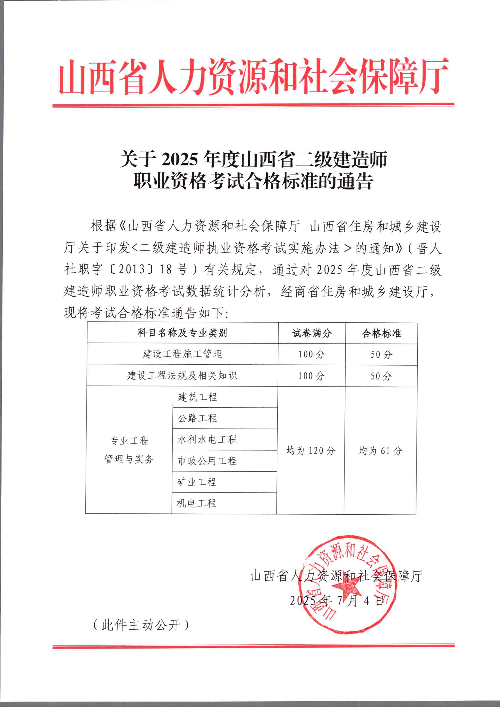 山西省人力資源和社會(huì)保障廳發(fā)布關(guān)于2025年度山西省二級(jí)建造師職業(yè)資格考試合格標(biāo)準(zhǔn)的通告,管理、法規(guī)50分,實(shí)務(wù)61分,具體信息如下: