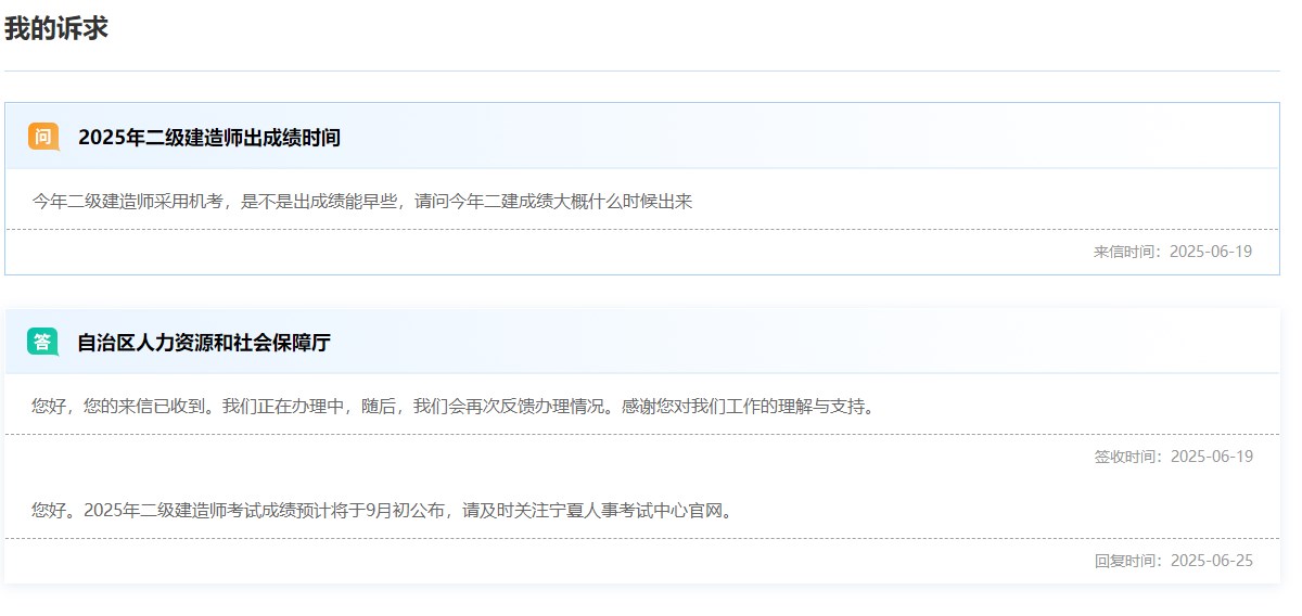 寧夏自治區(qū)人力資源和社會保障廳回復(fù):您好。2025年二級建造師考試成績預(yù)計將于9月初公布,請及時關(guān)注寧夏人事考試中心官網(wǎng)。