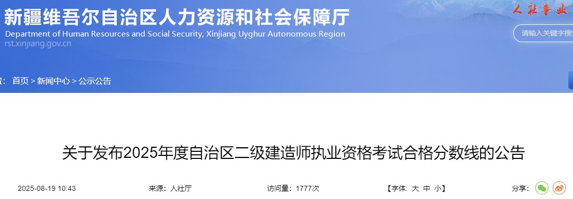 新疆維吾爾自治區(qū)人力資源和社會保障廳發(fā)布關于發(fā)布2025年度自治區(qū)二級建造師執(zhí)業(yè)資格考試合格分數線的公告,具體信息如下: