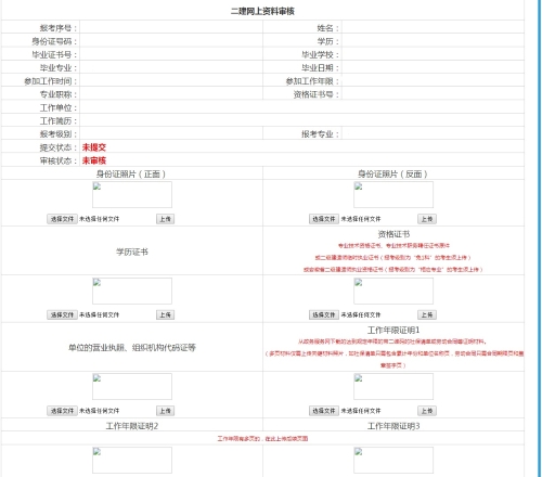 5、根據(jù)系統(tǒng)提示上傳對(duì)應(yīng)的資料,包括居民身份證、學(xué)歷證書(shū)(2002年大專及以上學(xué)歷請(qǐng)上傳學(xué)信網(wǎng)查詢的帶二維碼的學(xué)歷驗(yàn)證報(bào)告)、專業(yè)技術(shù)資格證書(shū)、專業(yè)技術(shù)職務(wù)聘任證書(shū)、二級(jí)建造師臨時(shí)執(zhí)業(yè)證書(shū)(報(bào)考級(jí)別為“免1科”的考生須上傳)、安徽省二級(jí)建造師執(zhí)業(yè)資格證書(shū)(報(bào)考級(jí)別為“相應(yīng)專業(yè)”的考生須上傳)、單位的營(yíng)業(yè)執(zhí)照(或組織機(jī)構(gòu)代碼證等)、工作年限證明(從政務(wù)服務(wù)網(wǎng)下載的達(dá)到規(guī)定年限的帶二維碼的社保清單或勞動(dòng)合同)(未選擇“告知承諾制”的必須上傳帶二維碼的社保清單,社保清單不足1年的還需上傳符合報(bào)考年限的勞動(dòng)合同)。
