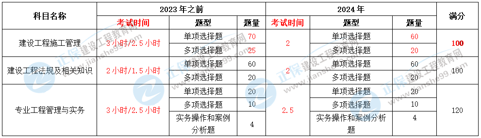 二、施工管理科目的時長縮短、題量下降且滿分從120分調整至100分。