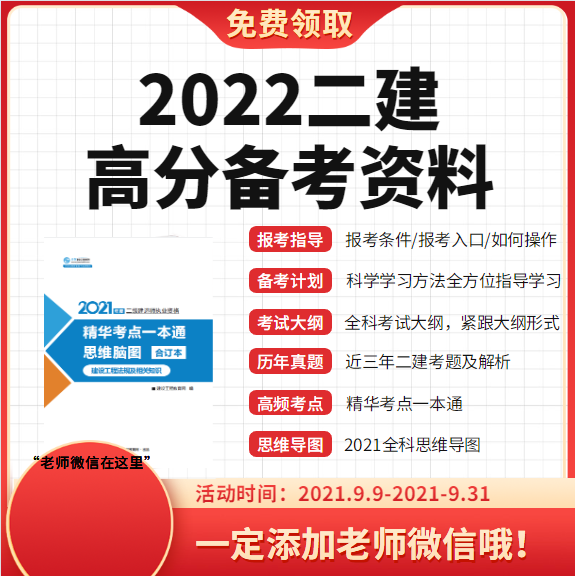2022二級建造師備考資料免費相送,掃碼領取.沒有套路,所有資料全部免費。9月開始二建成績陸續(xù)公布,更是開始備考的時間節(jié)點。備考快人一步,考試通過輕松,備考資料更是必不可少。二級建造師考試必備資料是由建設工程教育網教研團隊精心匯編,包含各科目考試重點及難點,還有知識點思維導圖,報考指導資料,全年備考計劃,歷年試題解析等等。網校同時提醒廣大考生抓緊時間學習,快人一步備考。資料在手,考試無憂!