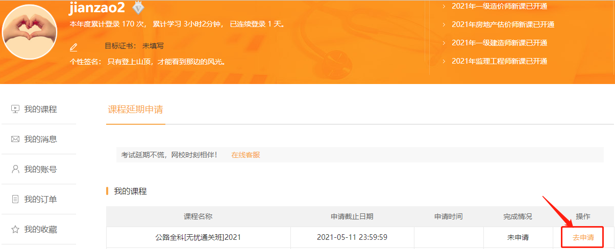 之前已經(jīng)報名網(wǎng)校2021年二級建造師考試課程的貴州、云南地區(qū)二建學(xué)員,可以申請課程延期了,入口在“我的網(wǎng)校我的家”,請大家及時申請,不要錯過。