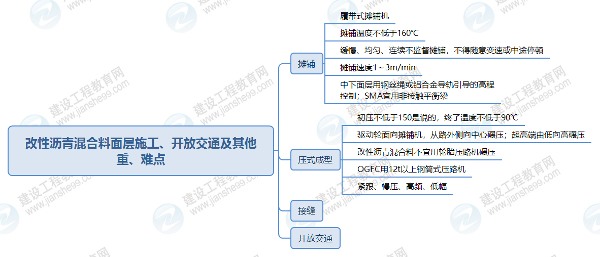 二建市政:改性瀝青混合料面層施工、開放交通及其他(思維導圖)