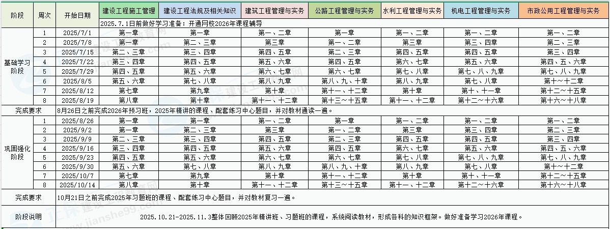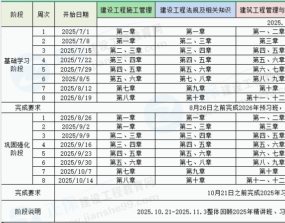 1、整體進(jìn)度說明:本計(jì)劃表從2025年7月1日開始執(zhí)行,計(jì)劃于2025年11月3日結(jié)束,共計(jì)18周;其中:基礎(chǔ)學(xué)習(xí)階段安排8周,鞏固強(qiáng)化階段安排8周,課程回顧階段安排2周。學(xué)員可根據(jù)本表的提示,結(jié)合自己的工作,學(xué)習(xí)情況進(jìn)行細(xì)化,并按網(wǎng)校要求完成聽課、做題的學(xué)習(xí)任務(wù),基本可滿足考試需要。