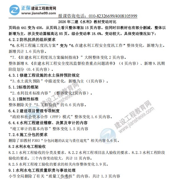 2026年二級建造師《水利實務(wù)》新教材變動梳理出爐!建設(shè)工程教育網(wǎng)教務(wù)團(tuán)隊拿到教材后第一時間為大家梳理變動詳細(xì)內(nèi)容,經(jīng)核對,2026年水利實務(wù)科目整體變動約18.6%,教材變動內(nèi)容如下,更多變動解讀請關(guān)注8月27日19:00孫琦老師直播間!