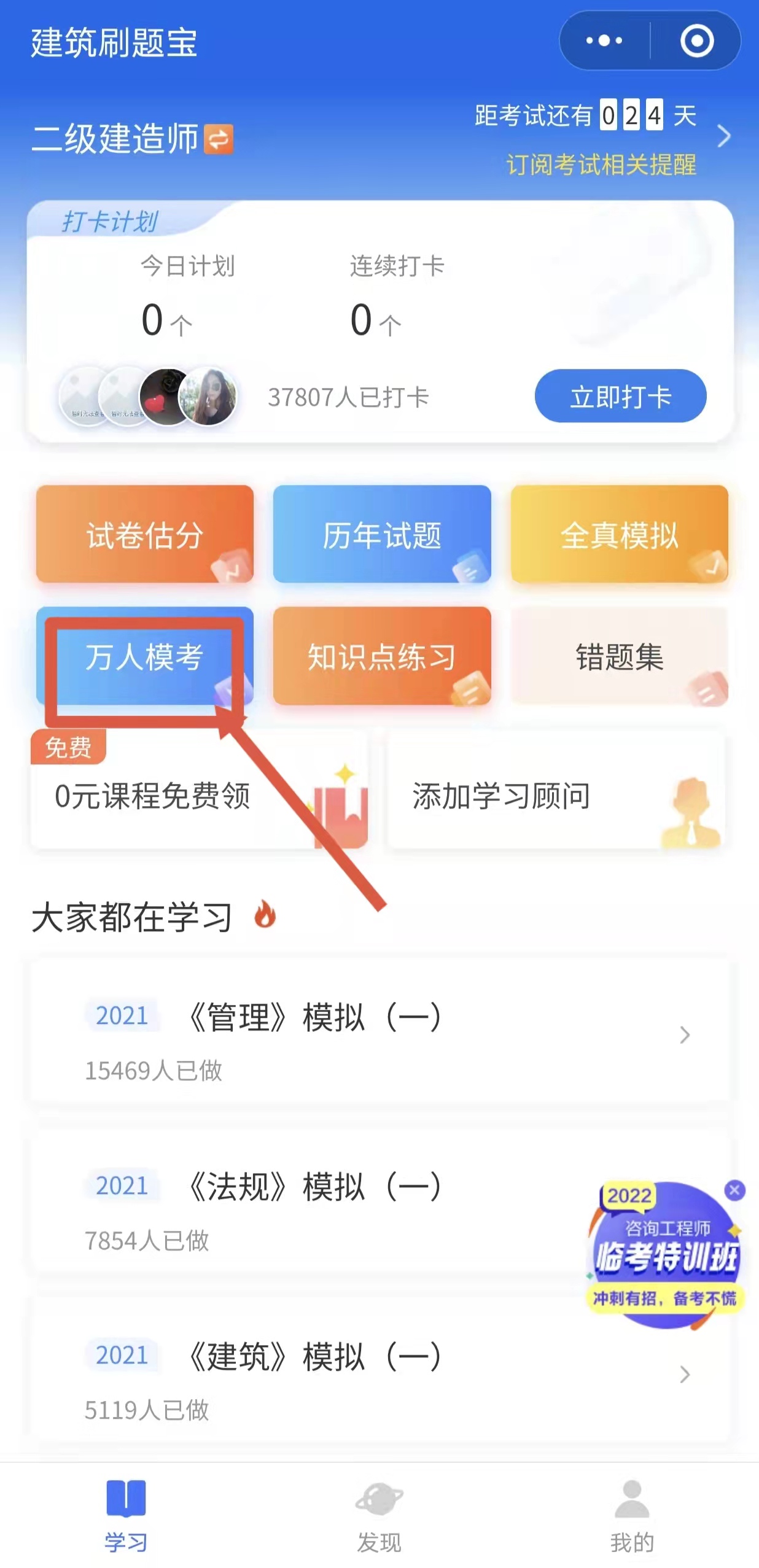 掃碼進(jìn)入建筑刷題寶——選擇二級建造師——萬人模考,點(diǎn)擊即可直接進(jìn)入模考中心。