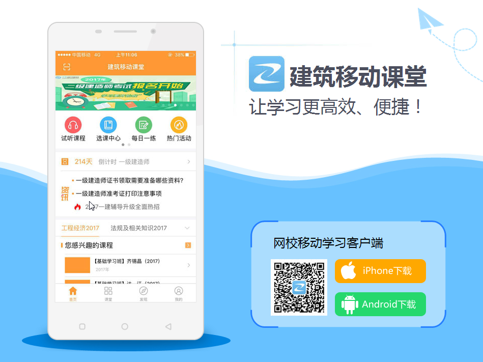 您還在為上下班時間空閑而感到無聊嗎,您還在為長期面對電腦而感到發(fā)愁嗎,您還在為沒有時間復(fù)習(xí)二建而擔(dān)憂嗎,不要擔(dān)心,建設(shè)工程教育網(wǎng)推出移動高清課堂,幫您輕松搞定二建!下載建筑移動課堂,想什么時候?qū)W,就什么時候?qū)W,地鐵,公交,電梯等等,拿出手機,輕松學(xué)習(xí)。立即購課,移動學(xué)習(xí)隨時隨地>>