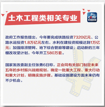 政府工作報(bào)告中指出2018年要完成鐵路、公路、水利等近3萬億元,基礎(chǔ)設(shè)施方面仍有不少機(jī)會(huì)。央視新聞同時(shí)點(diǎn)出土木工程類專業(yè),可謂是建筑人的福音,建筑產(chǎn)業(yè)位置依然牢不可撼。