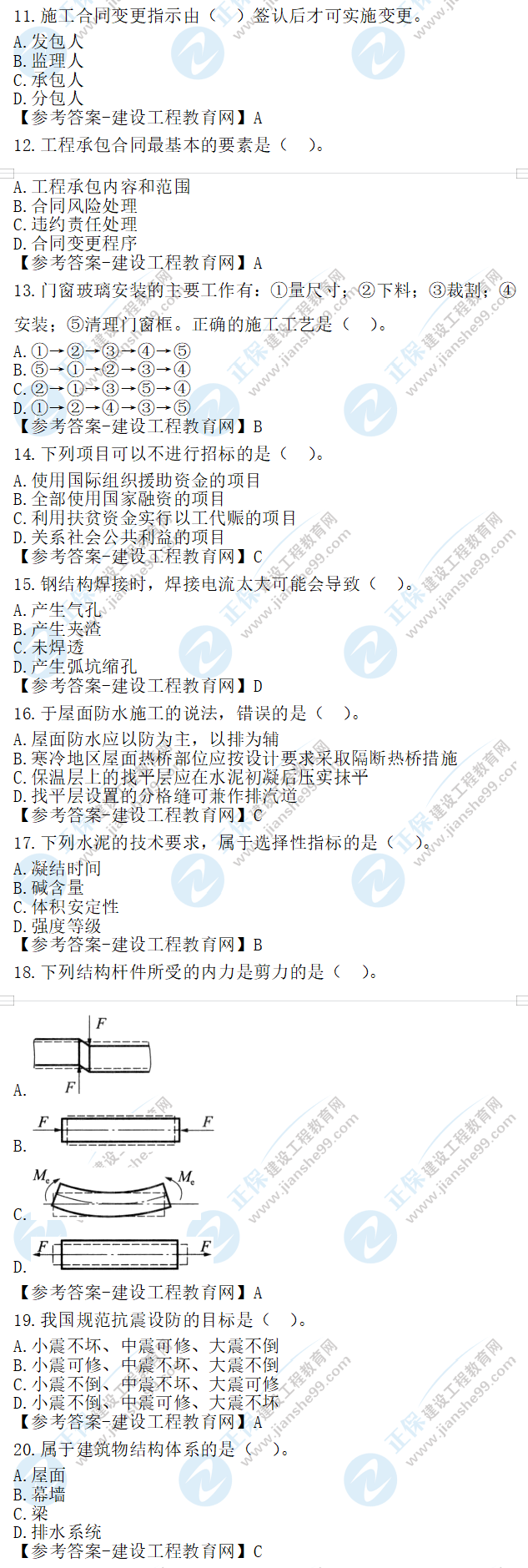 2023年二級建造師考試于6月3日、4日舉行,考試過后,廣大考生最關(guān)心的問題莫過于2023年二級建造師建筑實(shí)務(wù)真題及答案,建設(shè)工程教育網(wǎng)考后將會(huì)根據(jù)考生反饋,及時(shí)匯總2023年二級建造師建筑工程管理與實(shí)務(wù)真題及答案分享給大家。以下為2023年二級建造師建筑工程管理與實(shí)務(wù)11-20題真題及答案,希望能為廣大二建考生朋友帶來幫助。