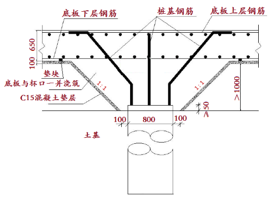 事件二:樁基首個(gè)驗(yàn)收批驗(yàn)收時(shí),發(fā)現(xiàn)個(gè)別樁有如下施工質(zhì)量缺陷;樁基頂面設(shè)計(jì)高程以下約1.0m范圍混凝土不夠密實(shí),達(dá)不到設(shè)計(jì)強(qiáng)度,監(jiān)理工程師要求項(xiàng)目部提出返修處理方案和預(yù)防措施。項(xiàng)目部獲準(zhǔn)的返修處理方案所附的樁頭與杯口細(xì)部做法如圖2所示
