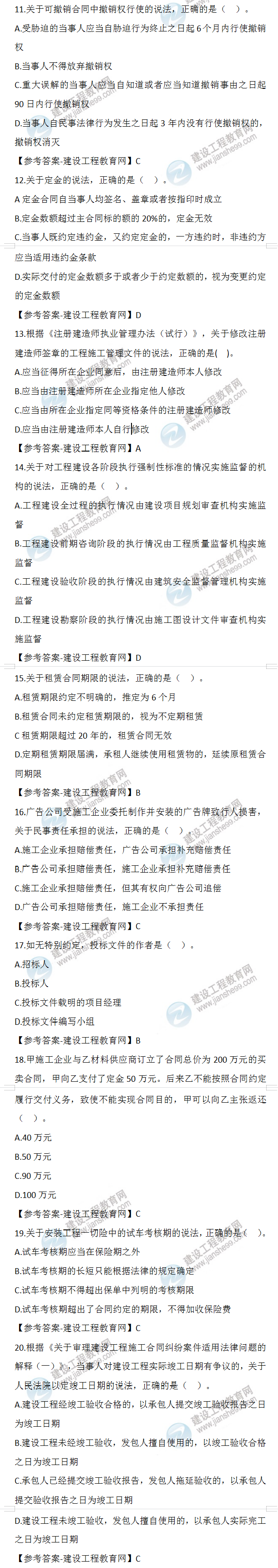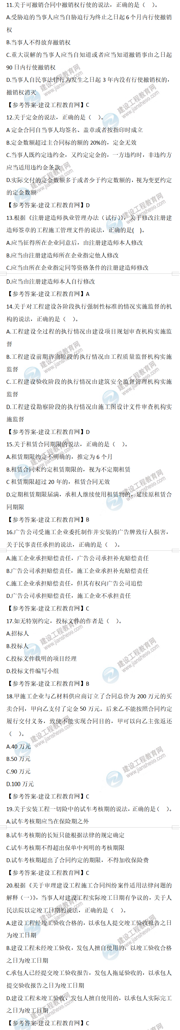 2022年二級建造師工程法規(guī)試題及答案11-20(11日2天3科)
