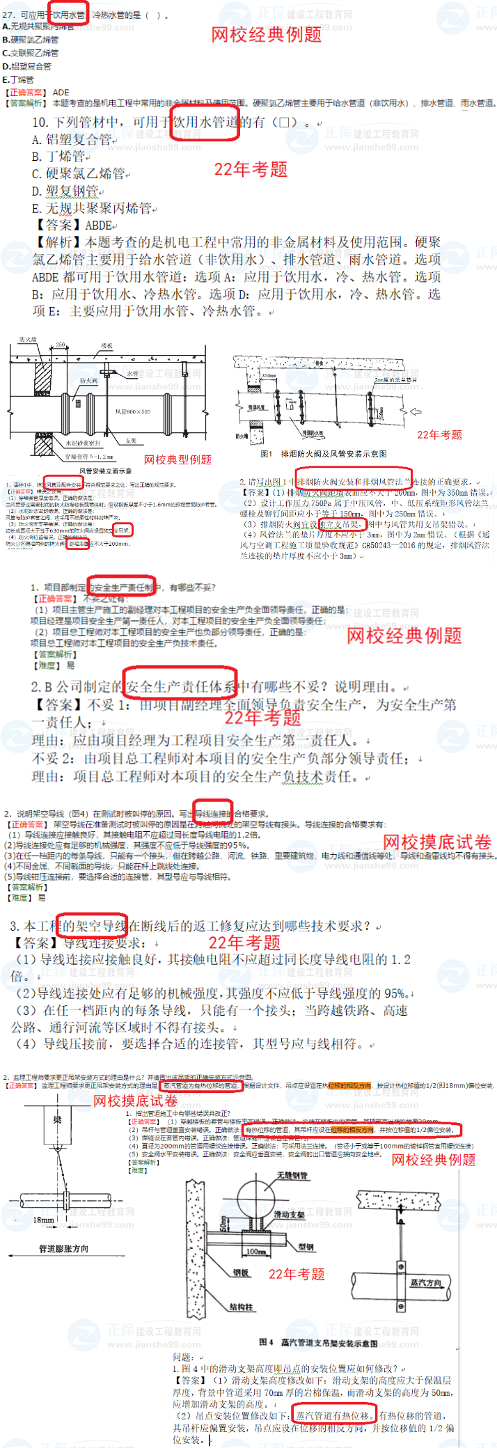 第二套(批次考試試卷):照明配電箱、燈具、插座;管道壓力試驗;空調(diào)水系統(tǒng)施工要點;單機試運轉(zhuǎn)要求;卷管制作要點(冷門);都屬于老師課堂中著重強調(diào)的傳統(tǒng)技術(shù)要點。