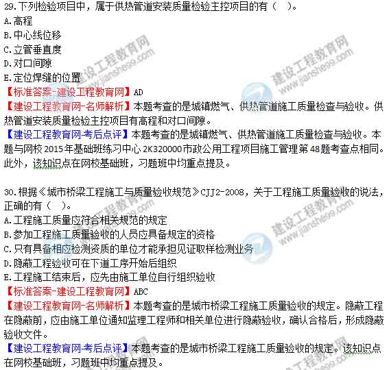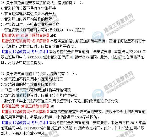 2015年二級(jí)建造師《市政公用工程管理與實(shí)務(wù)》答案及解析由老師整理而成,部分網(wǎng)站未經(jīng)許可擅自轉(zhuǎn)載、抄襲,造成內(nèi)容有所缺失或錯(cuò)誤,請(qǐng)大家以建設(shè)工程教育網(wǎng)發(fā)布為準(zhǔn)!二建試題答案