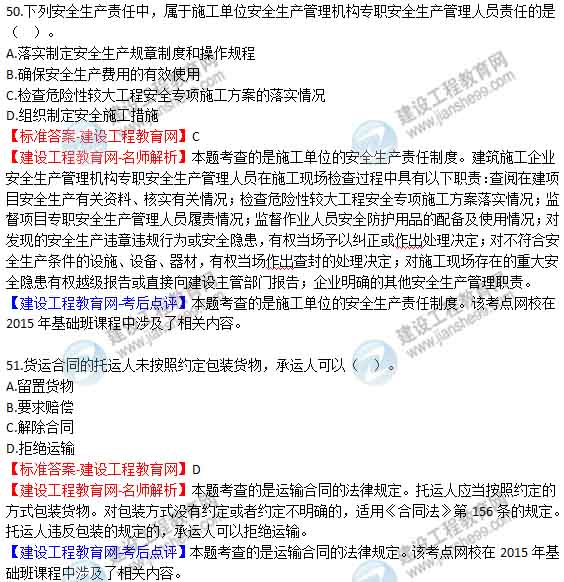 2015年二級(jí)建造師《建設(shè)工程法規(guī)及相關(guān)知識(shí)》答案及解析由老師整理而成,部分網(wǎng)站未經(jīng)許可擅自轉(zhuǎn)載、抄襲,造成內(nèi)容有所缺失或錯(cuò)誤,請(qǐng)大家以建設(shè)工程教育網(wǎng)發(fā)布為準(zhǔn)!二建試題答案