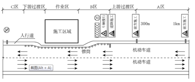 基坑臨近城市次干路,圍擋施工占用部分現(xiàn)況道路,項(xiàng)目部編制了交通導(dǎo)行圖(圖1)。在路邊按要求設(shè)置了A區(qū)、上游過渡區(qū)、B區(qū)、作業(yè)區(qū)、下游過渡區(qū)、C區(qū)六個(gè)區(qū)段,配備了交通導(dǎo)行標(biāo)志、防護(hù)設(shè)施、夜間警示信號(hào)。