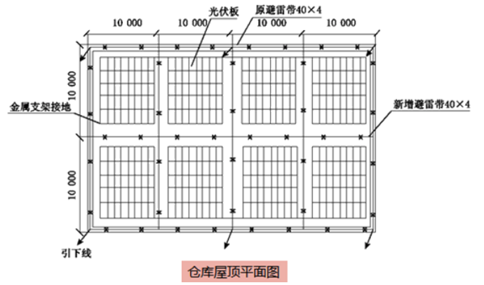 從圖中可以看出,施工后的倉庫建筑為二類防雷建筑(10m×10m)。