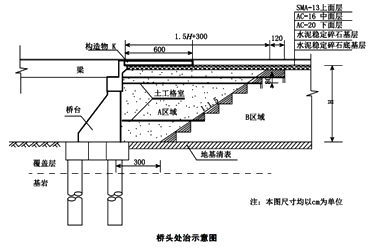 某施工單位承接了一條二級公路的施工,路線全長30.85km,路基寬度為8.5m,路面寬度為2×3.5m。該工程內容包括路基、橋梁及路面工程等。為減少橋頭不均勻沉降,防止橋頭跳車,橋臺與路堤交接處按下圖施工,主要施工內容包括:地基清表、挖臺階、A區(qū)域分層填筑、鋪設土工格柵、設置構造物K、路面鋪筑等。路面結構層如下圖所示,B區(qū)域為已經填筑完成的路堤填筑區(qū)域。