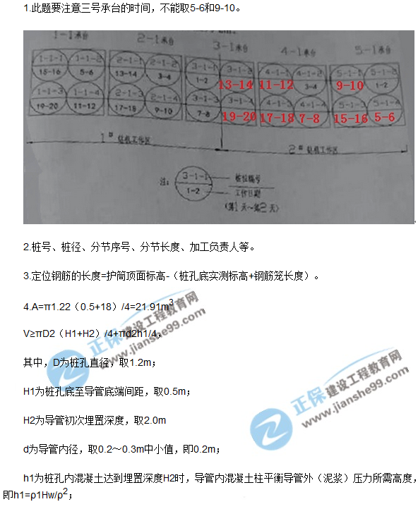 事件二:項目部對已加工好的鋼筋籠做了相應標識,并且設置了樁頂定位吊環(huán)連接筋,鉆機成孔、清孔后,監(jiān)理工程師驗收合格,立刻組織吊車吊放鋼筋籠和導管,導管底部距孔底0.5m.