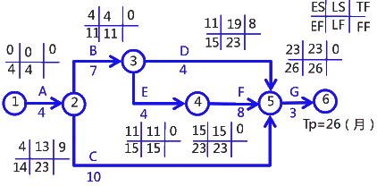 施工項(xiàng)目部編制了施工進(jìn)度計(jì)劃雙代號網(wǎng)絡(luò)圖如下(單位:月)