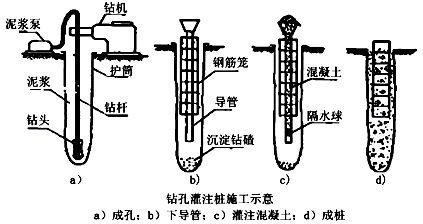 鉆孔灌注樁施工的主要工序有:埋設(shè)護(hù)筒、制備泥漿、鉆孔、清底、鋼筋籠制作與吊裝、灌注水下混凝土等。
