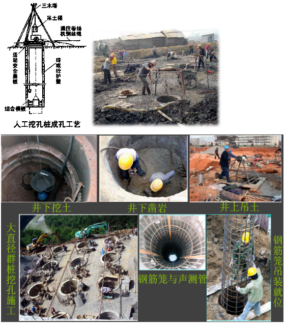 ?。?)樁孔必須挖一節(jié)、澆筑一節(jié)護(hù)壁,地質(zhì)較好護(hù)壁高度一般為1m,嚴(yán)禁只挖不及時(shí)澆筑護(hù)壁的冒險(xiǎn)作業(yè)。