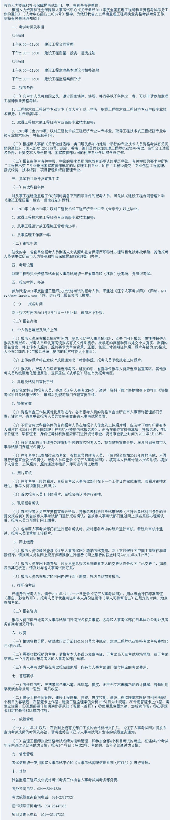- ·2011年遼寧省監(jiān)理工程師報名時間為2011年2月21日-3月14日