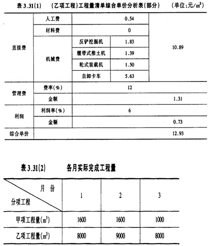 合同工期內(nèi),承包商每月實際完成并經(jīng)工程師簽證確認的工程量如表3.31(2)所示。