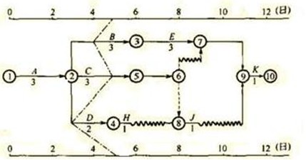 1、已知時(shí)標(biāo)網(wǎng)絡(luò)計(jì)劃的前鋒線進(jìn)行實(shí)際進(jìn)度與計(jì)劃進(jìn)度比較圖如圖所示,則( ?。?。