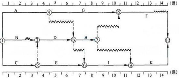 答案解析:B工作的自由時差就是B工作箭線上波形線的長度為1周。B工作的總時差=B工作的自由時差+D工作的總時差=1+1=2周。參見教材P228。